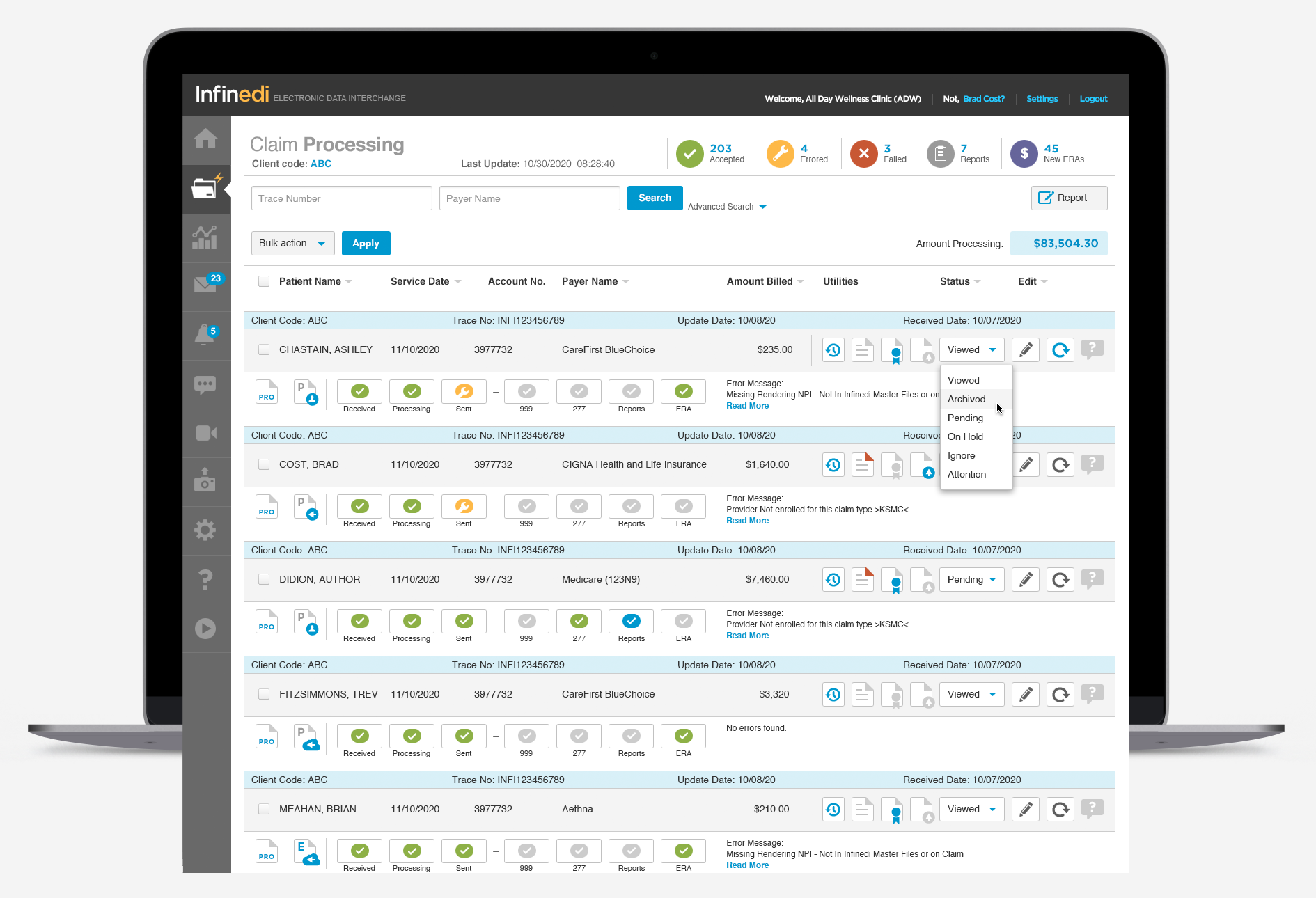 The quick-action bar allows physicians to see claims accepted, pending and failed at a glance.