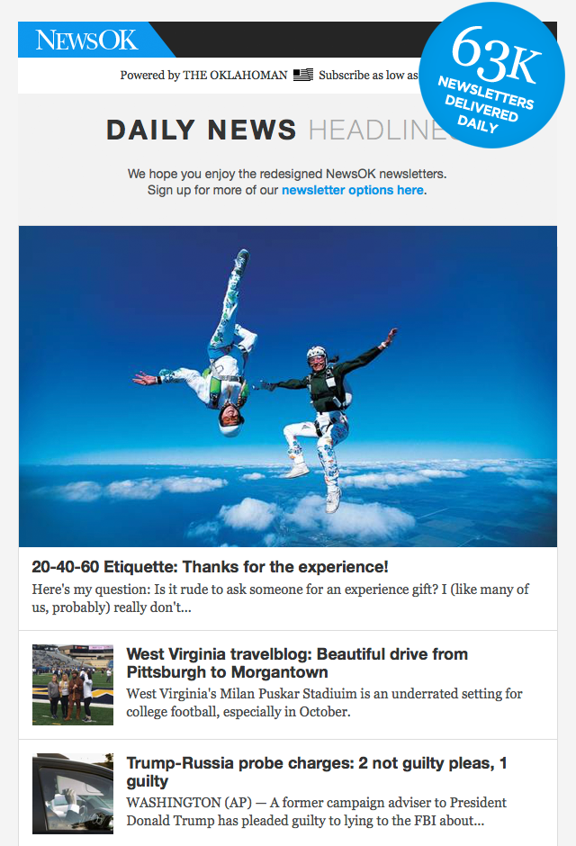 Manage vendor relationship with Mather Economics to engage and convert NewsOK audience segments along a path for newsletters signups, based upon a users most viewed news topic – totaling 63,500 daily deliveries.